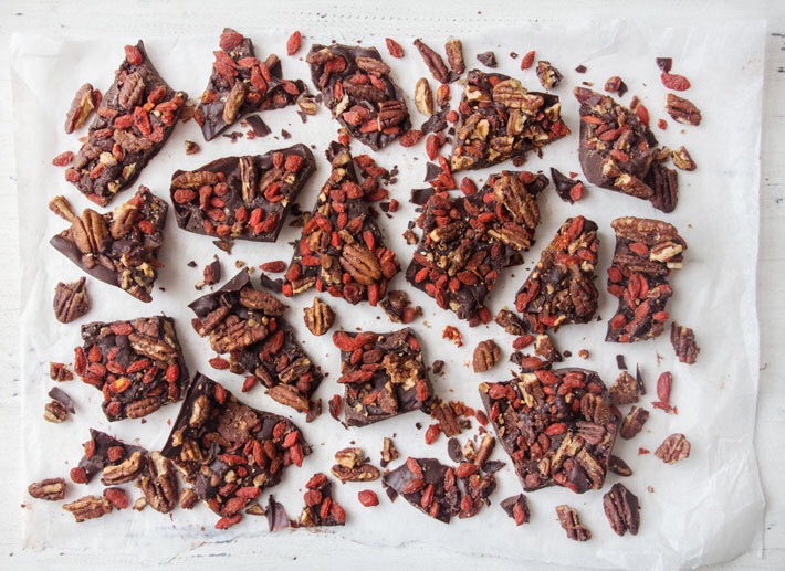 - Line a dish or baking tray with a new sheet of parchment paper and pour the chocolate mix over it until it is a little less than half an inch deep. Then sprinkle the pecans and goji berries over it, using a spatula to gently press them into the chocolate so they stick.