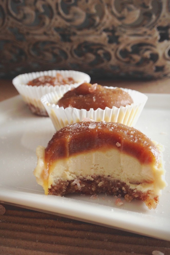 - Remove the mini cheesecakes from the freezer 15 minutes prior to serving so that they can thaw. Pour the salter caramel sauce into a resealable ziplock bag and cut one corner off. Squeeze a dollop of caramel on top of each cheesecake bite.